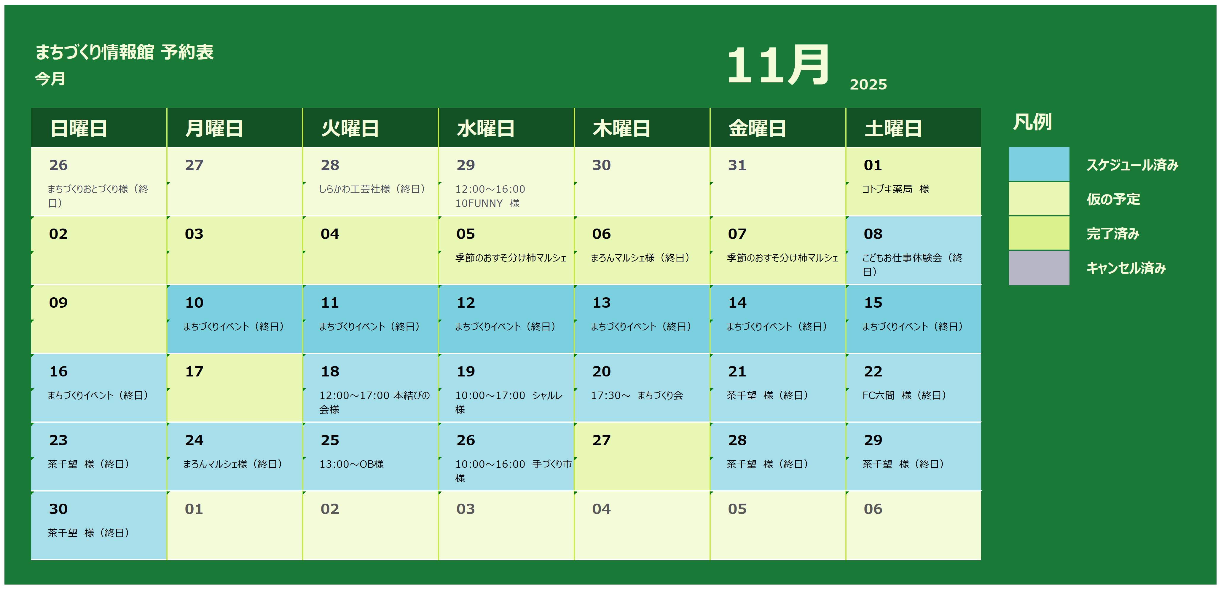 11月は「まちづくりイベント」など大型行事が予定されています。よい季節ですので空き日時を是非ご利用ください。